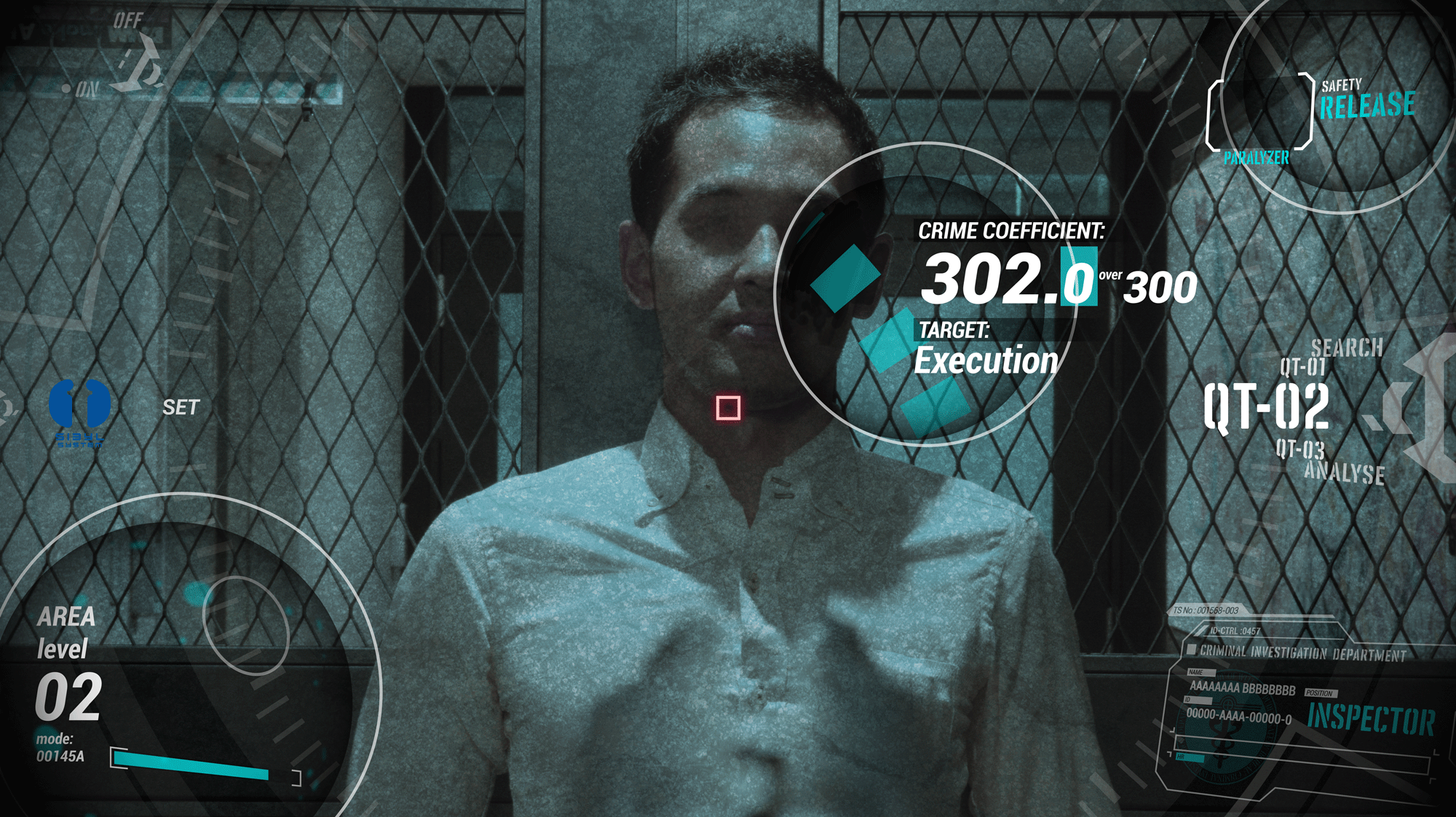 アプリの画面にはカメラの画像が表示されます。人物に向けて本体を固定し、トリガーを半押しすると対象の犯罪係数を測定します。測定が完了すると犯罪係数を音声で通知するほか、犯罪係数に応じてParalyzerまたはEliminatorへ変形します。